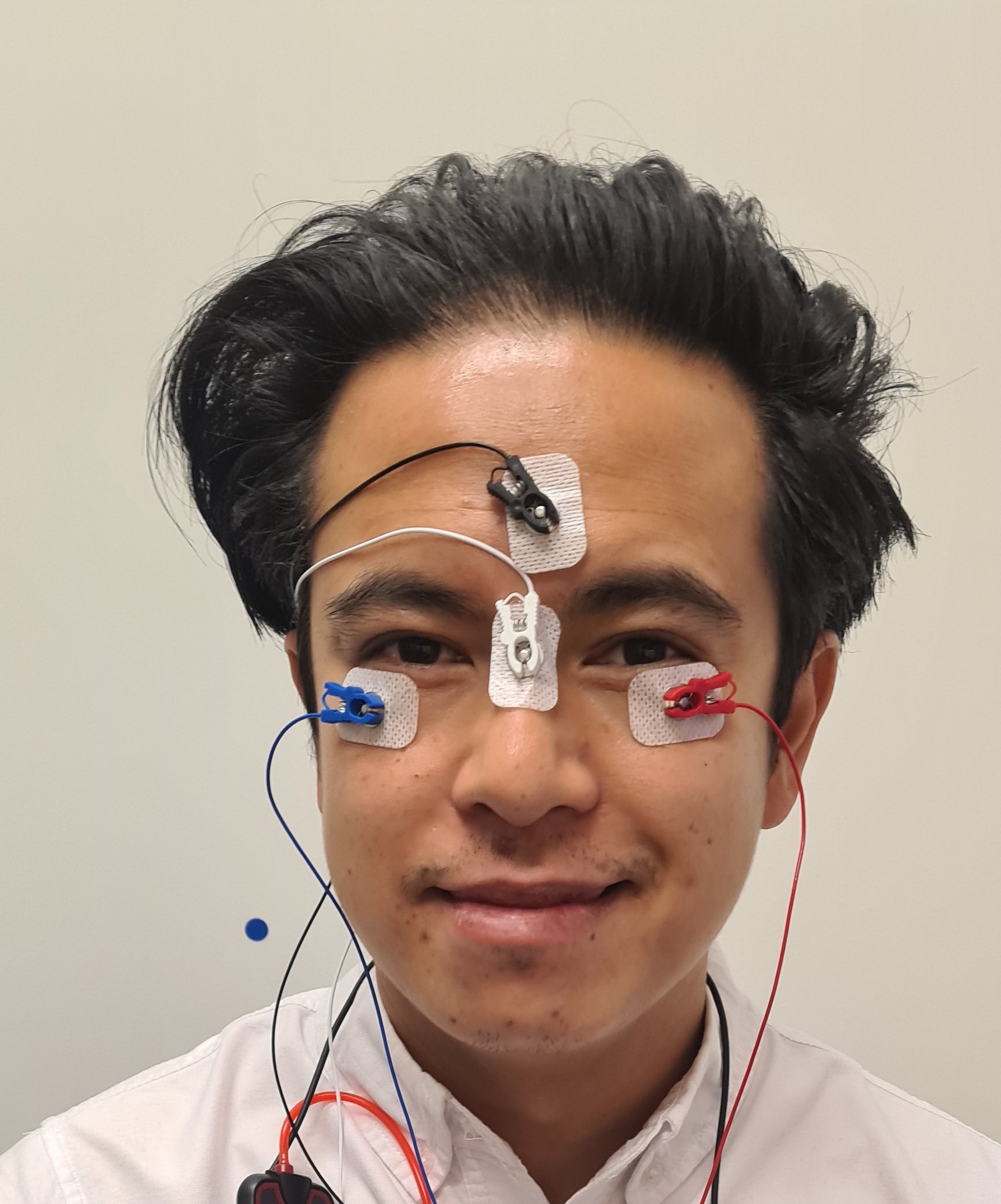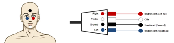 We recommend the electrode configuration as below. Avoid the lower eyelid placement too close to inner corner of the eye (medial canthus) as there is a null point in this area, giving no response. If you have no response from oVEMP – check this placement as incorrect placement of the electrodes under the eyes can make a difference in the results achieved.